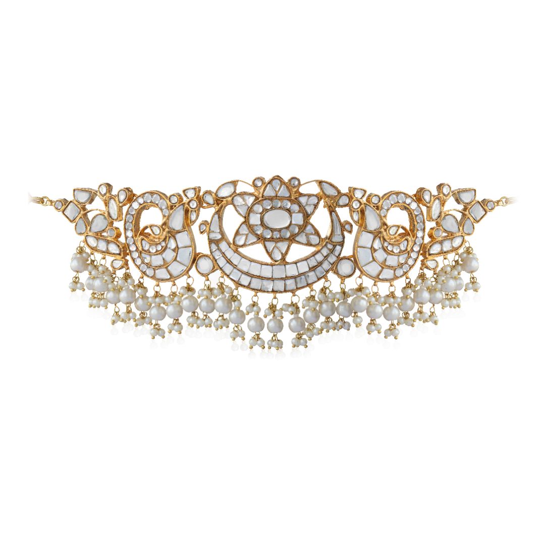 A regal kundan choker featuring bold peacock and floral motifs set with mirror polki, sapphire and ruby along with delicate yellow pearl and ruby hangings. Plated in 22k gold and designed to pair with the Zari Earrings, this handcrafted piece is perfect for nikkah, bridal wear, or formal festive occasions.
