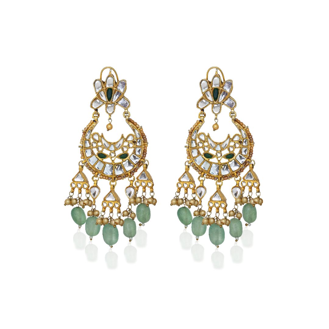 These exquisite kundan chandbalis are designed with intricate crescent motifs in mirror polki, accented with gold and light green bead clusters. Handcrafted and finished with 22k gold plating, the Nayab Chandbalis are perfect for mehndi, sangeet, or festive evening wear.